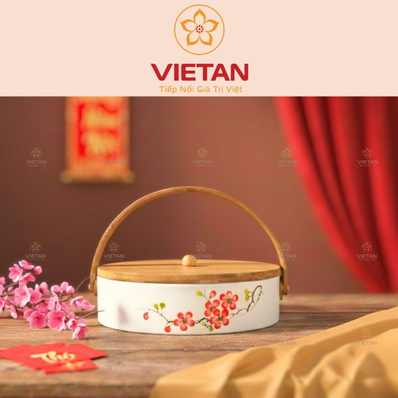 Sự kết hợp giữa gốm sứ Bát Tràng và chất liệu gỗ tự nhiên ấm áp của khay mứt KM07 tạo nên vẻ đẹp hài hòa, tinh tế, vừa hiện đại vừa gợi nhớ đến nét đẹp truyền thống ngày Tết Việt.